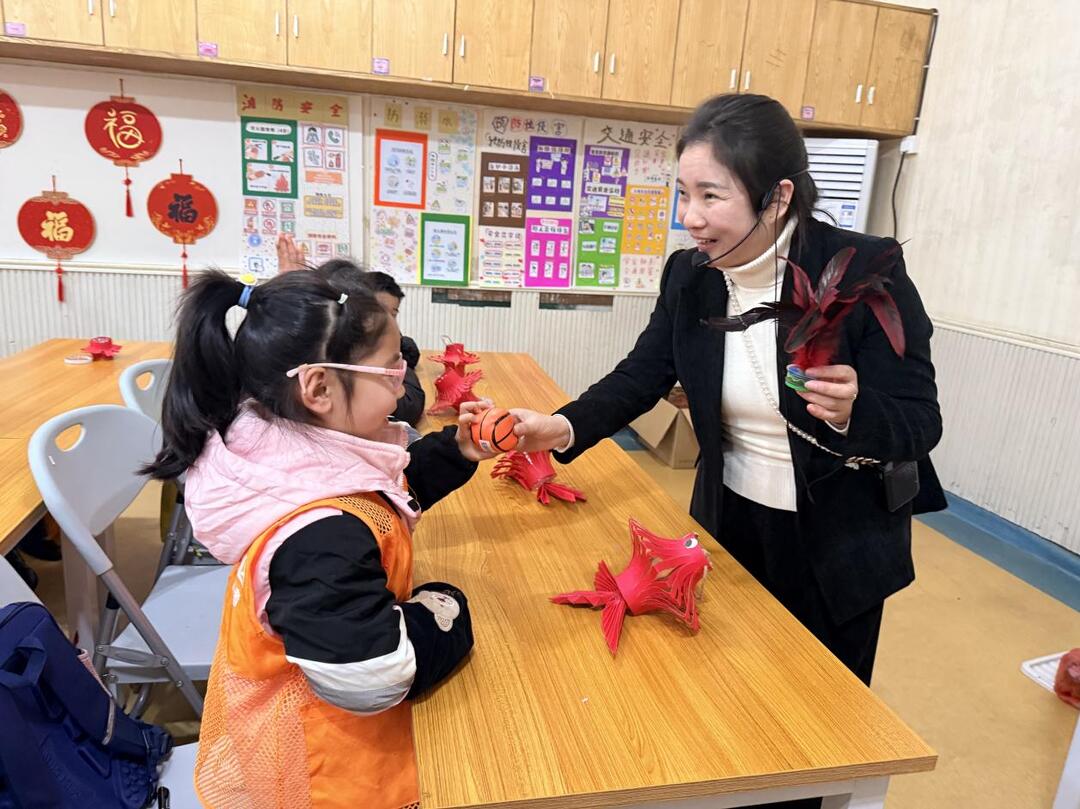 手工实践环节,金老师紧扣新年民俗主题,带领孩子们动手制作金鱼灯笼。她逐一讲解制作材料、拆解制作步骤、示范操作技巧,耐心细致地引导每一位孩子。志愿者们分组陪伴,贴心协助孩子们整理材料、用塑料瓶固定灯笼骨架、粘贴喜庆装饰,全程保驾护航。孩子们全神贯注,认真折叠、粘贴、组装,把对新年的美好期许,细细融入每一个制作细节。经过一个多小时的巧手创作,一个个灵动可爱的金鱼灯笼陆续完工,红彤彤的灯笼映着孩子们灿烂的笑脸,现场处处洋溢着浓浓的年味与童真欢乐。