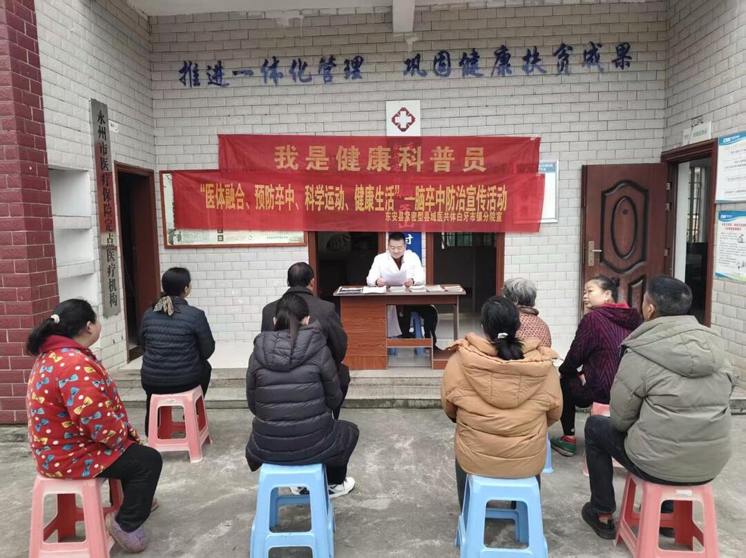 活动现场气氛热烈。卫生院医务人员设立了健康咨询台,为前来参与的村民提供免费血压测量服务,并依据测量结果给予个性化的健康指导。公卫医师面向群众,重点讲解了中年人群体中常见的脑卒中危险因素,包括高血压、高脂血症、糖尿病等基础疾病,以及过量饮酒、吸烟、不良饮食习惯和缺乏运动等不健康生活方式。