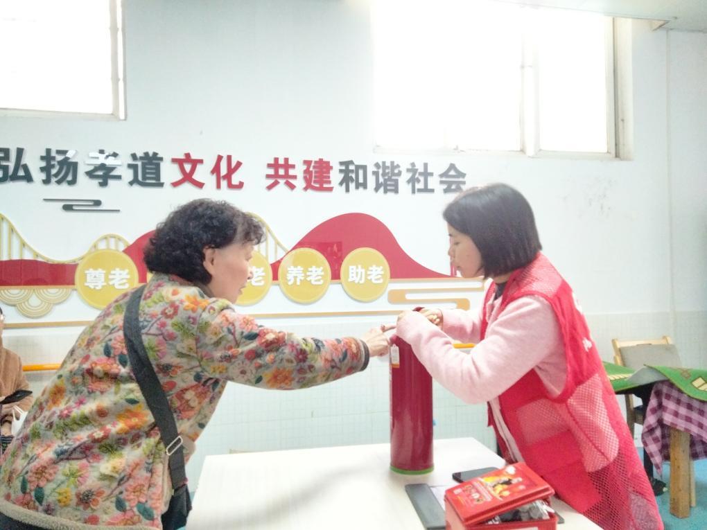 此次讲座以“理论讲解+实操演示+互动答疑”的形式,让消防知识真正深入人心。讲座开始,志愿者用通俗易懂的语言与生活化表达,重点解读了居家消防安全要点:从冬季取暖设备安全使用、电器线路自查方法,到燃气泄漏应急处置、火灾报警正确流程,逐一拆解老年人日常起居中容易忽视的安全隐患。针对老年人记忆力特点,志愿者总结提炼了“提、拔、握、压”灭火器使用口诀、“捂鼻低姿贴墙走”逃生要领等实用技巧,方便老人快速记忆与运用。
