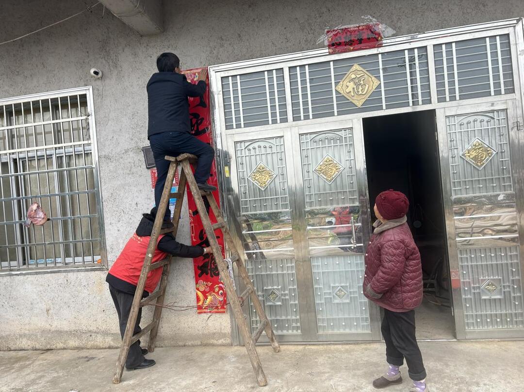 ▲志愿者为老人贴春联、念对联,传递新春关爱