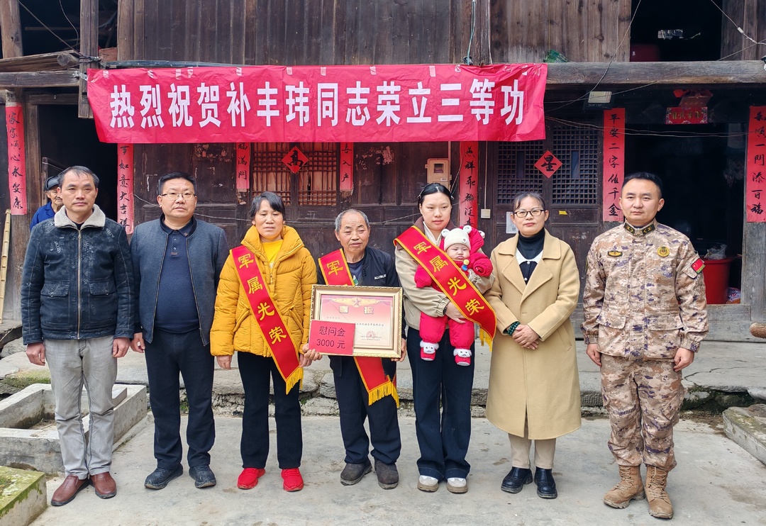 华声在线2月12日讯(通讯员 周军 杨承渊)为进一步弘扬拥军优属光荣传统,营造“一人立功、全家光荣”的良好氛围,激发广大官兵安心服役、建功军营的热情,2月12日,芷江侗族自治县退役军人事务局联合梨溪口乡武装部,为荣立三等功的现役军人补丰伟家属送去喜报和慰问金,让军属共享荣耀与喜悦。