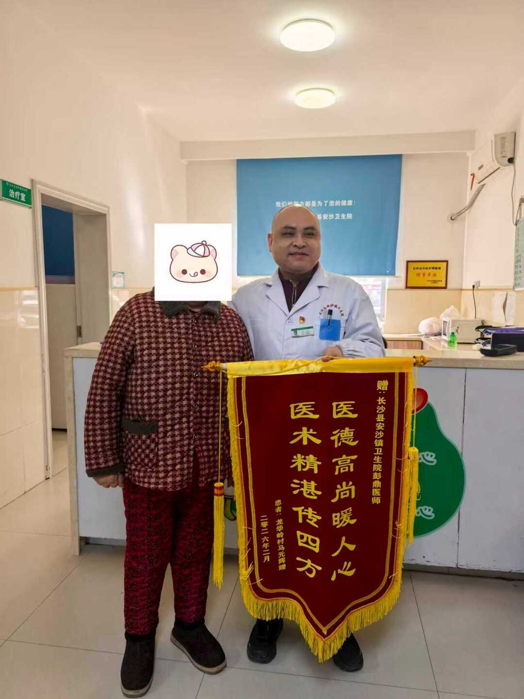 同样感受到党员医者温暖的,还有龙华岭村的马娭毑。马娭毑长期被高血压困扰,血压曾一度飙升至220/120mmHg,辗转尝试多种用药方案,血压始终难以得到有效控制,这让她和家人忧心不已。得知这一情况后,在卫生院党支部的引领下,党员医生彭鼎牵头组建专项诊疗小组,主动对接马娭毑,为她完善了全套高血压相关检查,全面排查致病诱因。同时,依托医共体联动机制,诊疗小组主动对接上级医院高血压专科专家,反复研讨病情、优化治疗方案,经过多轮调整,仅用两周时间,就成功将马娭毑的血压控制在正常范围,让老人摆脱了高血压的困扰。随后,马娭毑特意送来一面印着“医德高尚暖人心,医术精湛传四方”的锦旗,以此表达对彭鼎医生及诊疗小组的诚挚谢意。