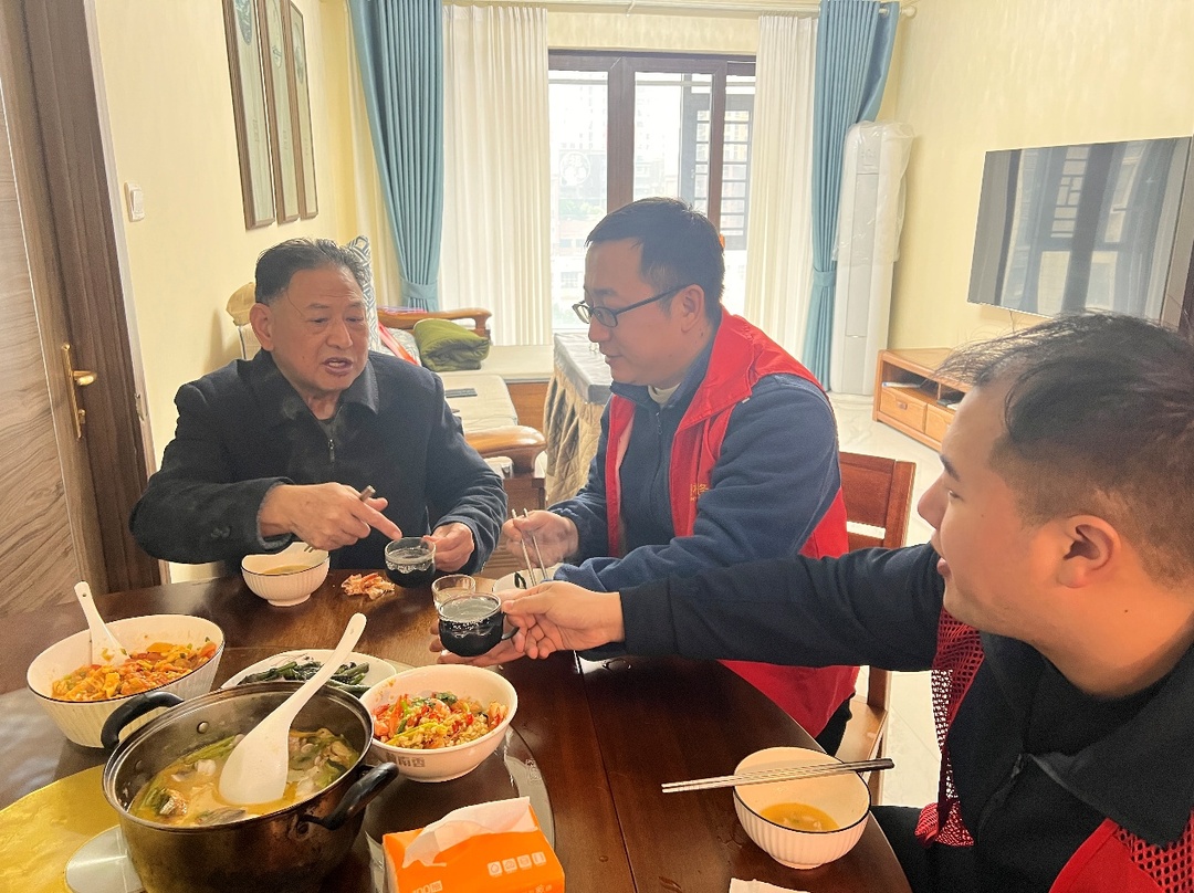 用餐时,党员志愿者们围坐在老人身边,陪老人们唠家常、问冷暖,细心询问身体状况与生活需求,倾听心声、排解孤寂,叮嘱老人注意冬季身体健康管理和用火用电安全,提前送上新春祝福。餐桌上暖意融融,老人脸上洋溢着幸福的笑容,表示:“辛苦你们的忙碌,有你们陪着吃饭,这个年过得特别暖心!”