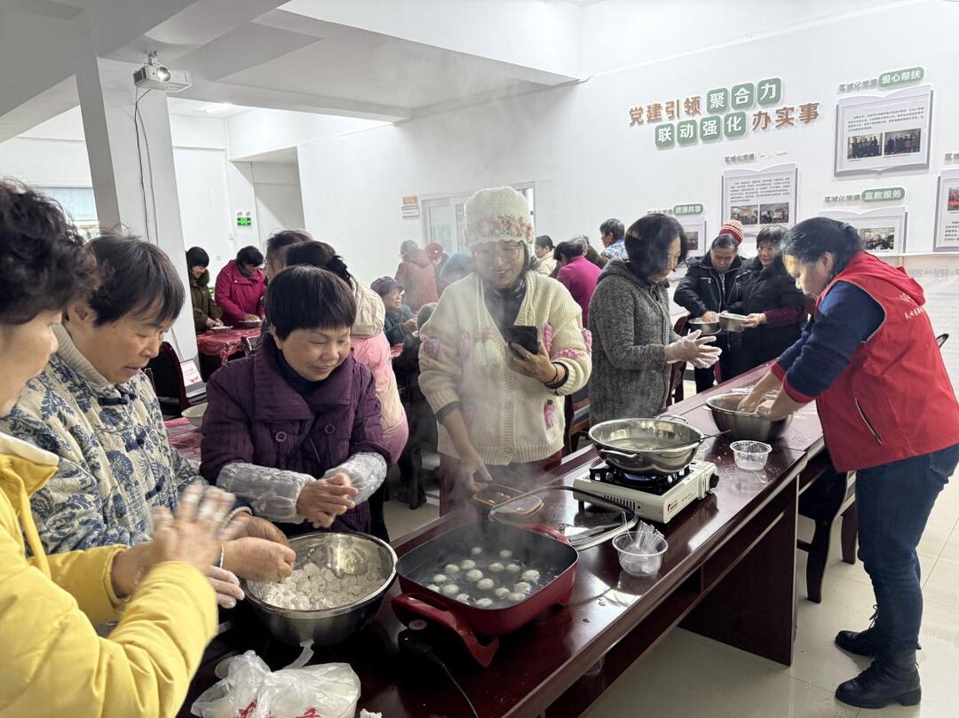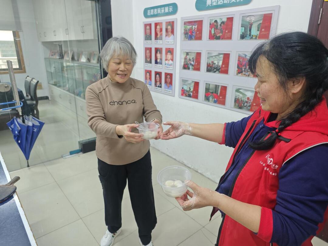 活动现场暖意融融、欢声笑语不断。社区提前准备好糯米粉、白糖、一次性餐具及煮锅等物资,居民自带盆具踊跃参与。大家围坐在一起,揉面团、搓圆成型,互相交流制作技巧,分享节日喜悦。一颗颗圆润饱满的汤圆相继成型,承载着团圆美满的美好祝愿,在轻松温馨的氛围中拉近了邻里距离。