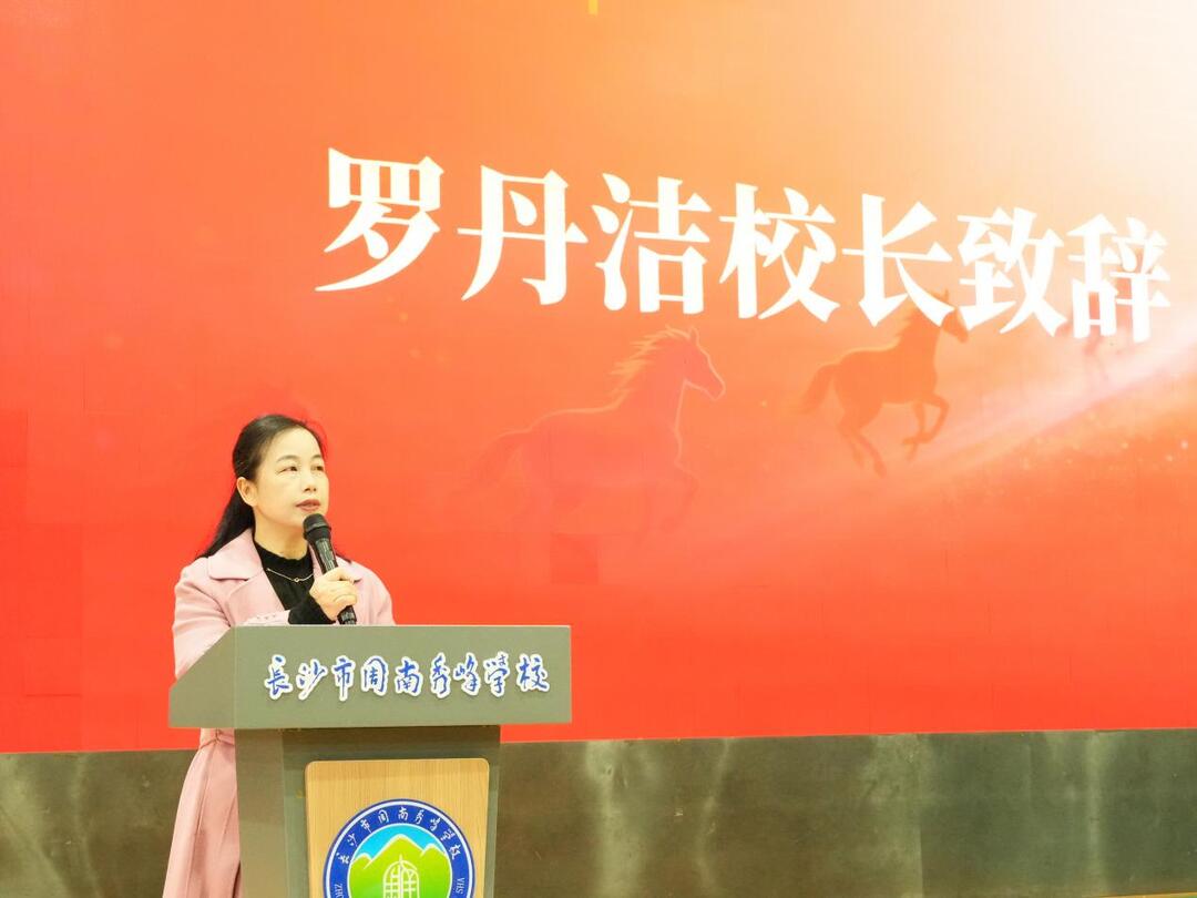 典礼伊始,罗丹洁校长发表《弦歌不辍·再启新程》致辞。她回顾 2025 年全校师生拼出的“厚重成绩单”,致敬每一位奋斗者。展望新程,罗校长强调:“健康是奔腾的基石。”她勉励师生以雷锋精神为引,将强健体魄与阳光心态作为弘扬龙马精神的前提,唯有如此,方能蹄疾步稳,在新时代赛道上跑出速度与质量,绘就幸福人生。