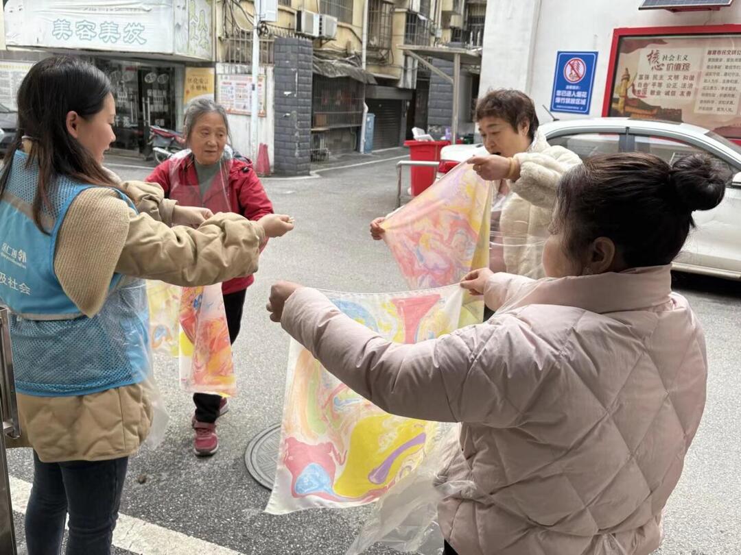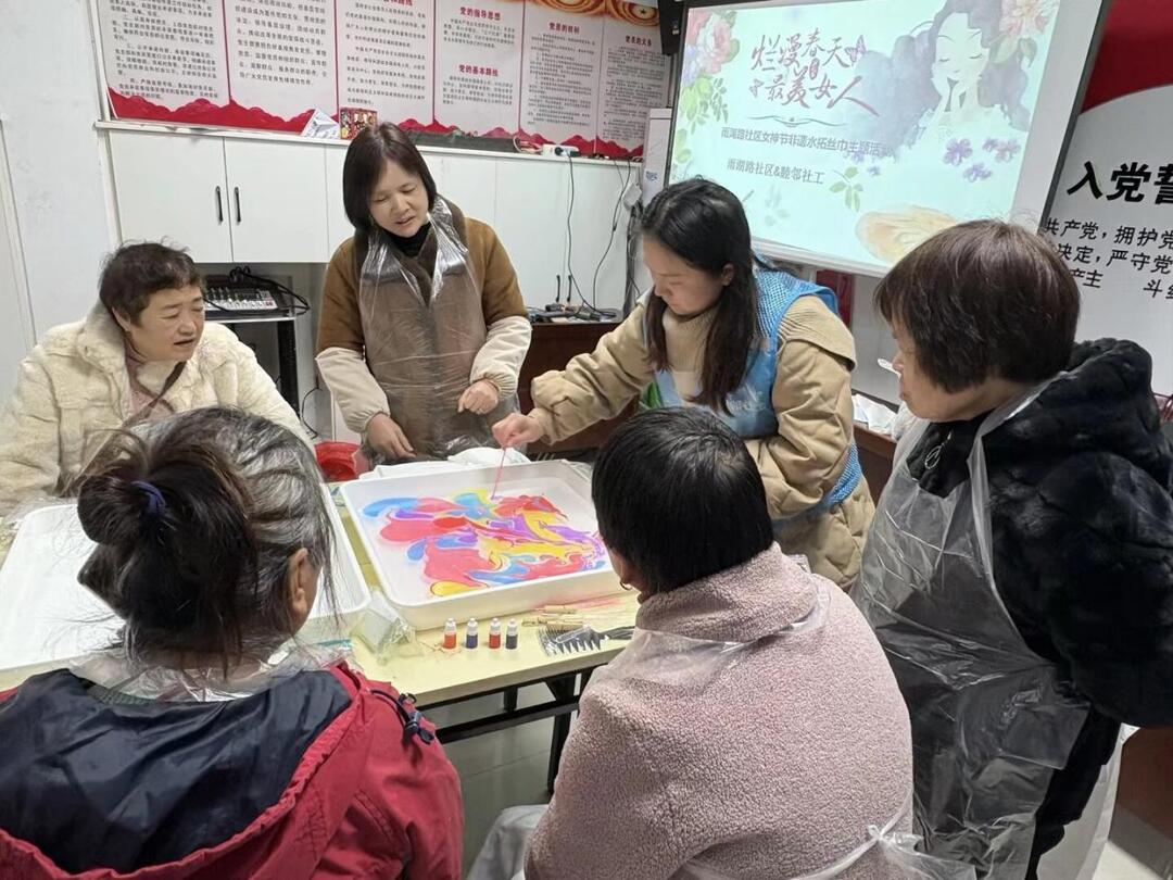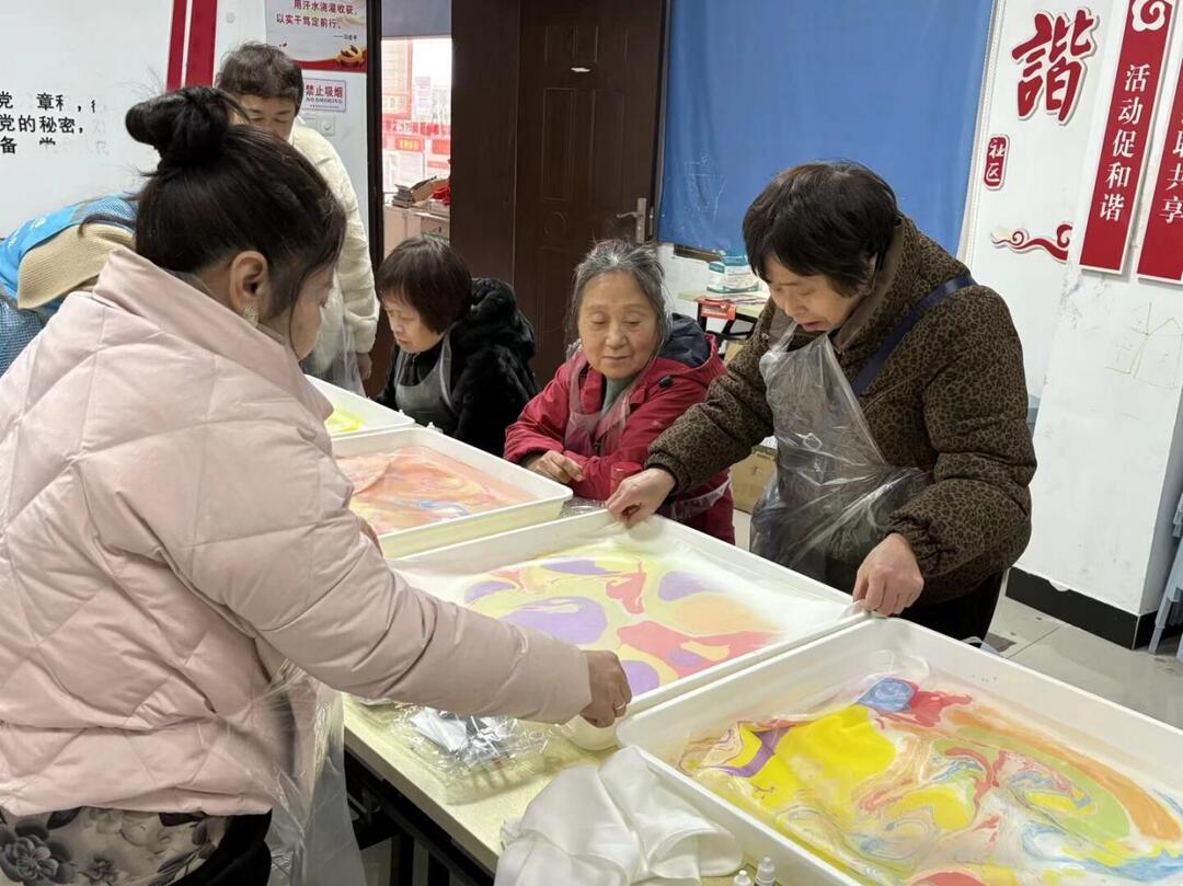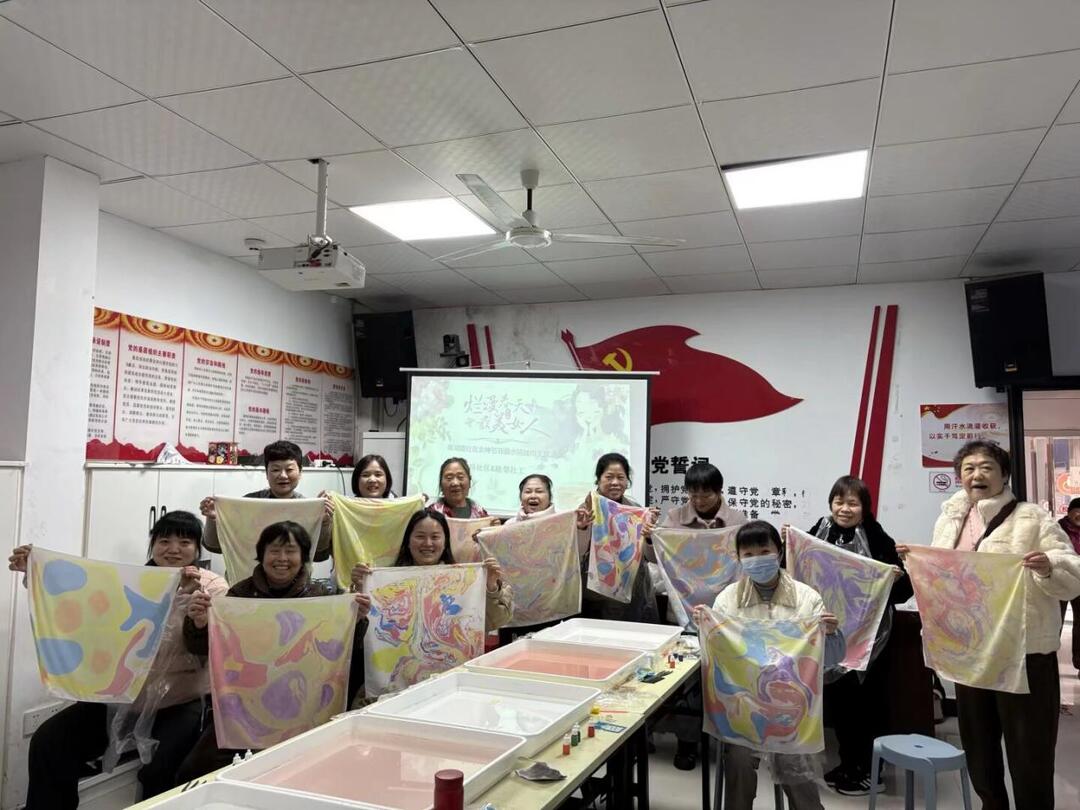 活动尾声,大家围坐一起,分享创作心得,交流生活感悟。一条条色彩斑斓的水拓丝巾,如同姐妹们绚丽多姿的人生;一次次颜料的扩散交融,恰似邻里间互助友爱的温情传递。这场“水”与“丝”的邂逅,不仅绘就了女性的指尖芳华,更织密了社区的情感纽带,为春日的雨湖路增添了一抹温暖亮丽的色彩。