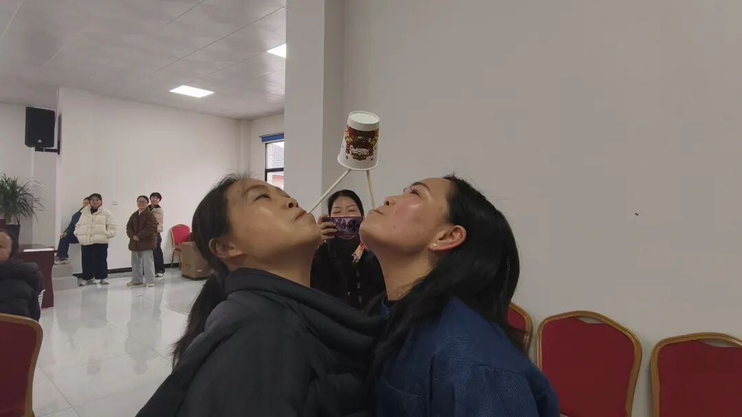 本次活动设置了“蒙眼取水”和“纸杯传送”两项趣味小游戏。在“蒙眼取水”环节,参赛者蒙眼原地转5圈后,需在1分钟内摸索前行取到矿泉水,过程既考验平衡感又充满乐趣;“纸杯传送”游戏则要求每组4人用嘴咬住筷子传递杯子,充分体现了团队协作与默契。活动现场,工作人员各司其职,确保游戏有序进行,参与者们热情高涨,尽情享受节日的轻松与快乐。