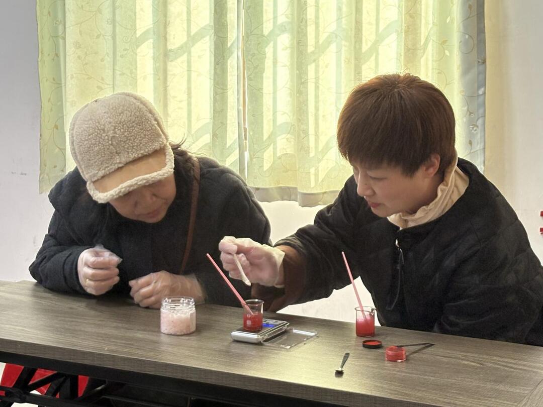 活动现场,社工老师早早准备好了蜂蜡、植物油、色粉、维生素E等天然原材料,以及烧杯、模具、电子秤等制作工具。在专业社工老师的指导下,大家从挑选色号、调配原料开始,一步步体验口红制作的全过程。加热、搅拌、灌装、凝固……每一个步骤都充满乐趣与期待。平日里忙于工作和家务的阿姨们,此刻化身为专注的“调色师”,精心调制着属于自己的专属色彩。