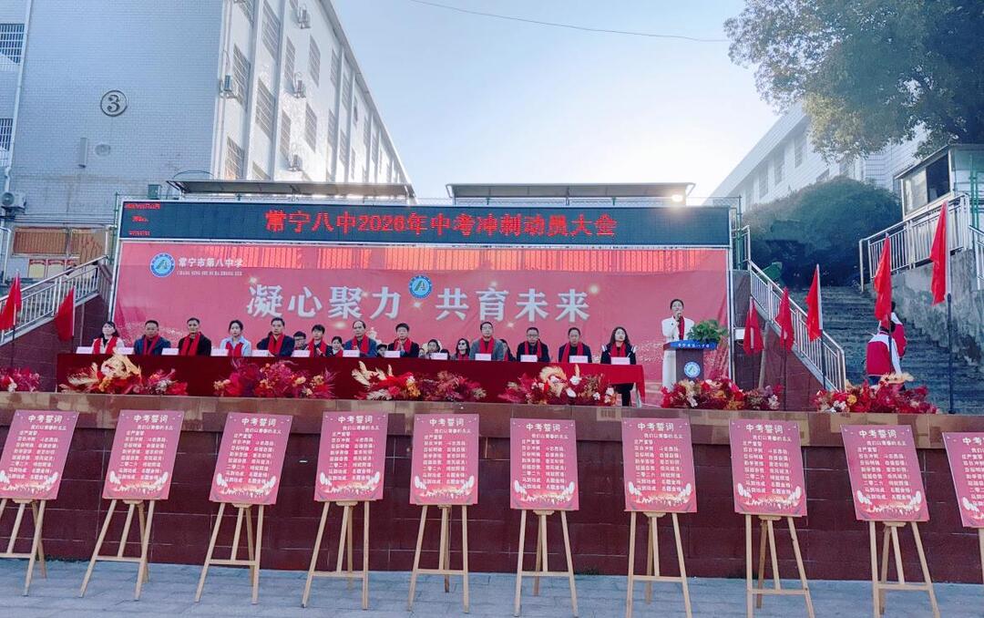 华声在线3月16日讯(通讯员 张丽萍 滕婷)春潮涌动千帆竞,百日攻坚正当时。3月13日上午8时,常宁市第八中学大操场彩旗飘扬、士气高昂,2026届中考百日冲刺动员大会在此举行。九年级全体师生与家长代表齐聚一堂,怀揣着对梦想的憧憬与对未来的期许,以青春立下铮铮誓言,以奋斗扬起逐梦风帆,共同奏响中考冲刺的激昂乐章。本次大会以“百日磨砺酬壮志 骐骥驰骋向未来”为主题,由2304班周昊、雷婉腾两位同学担纲主持。