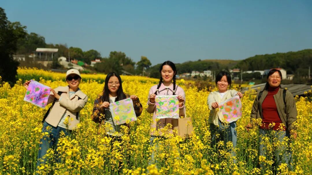 金黄花海间,欢声笑语不断。大片油菜花田迎风绽放,满目绚烂春意,女神们驻足打卡,用镜头定格笑颜与春光,在花香中尽享田园惬意,流连忘返。