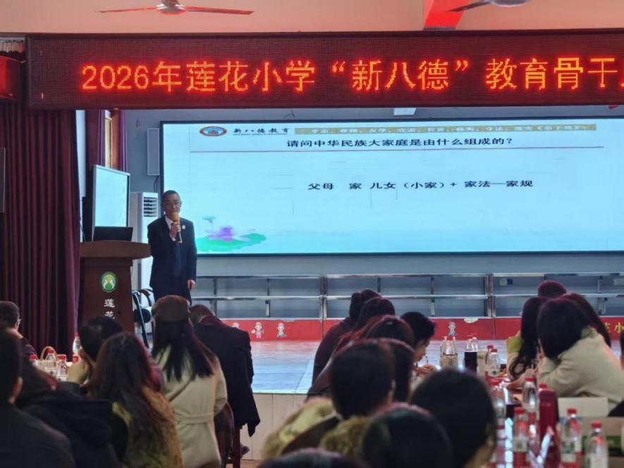 华声在线3月23日讯(通讯员 詹先坤 王甜)为坚守为党育人、为国育才初心使命,全面落实立德树人根本任务,深入推进“新八德”教育体系落地见效,近日,常宁市莲花小学组织开展了第一期“新八德”教育骨干成员集中培训活动。学校特邀邵阳县“新八德”高级讲师杨迪莅临授课,全体行政人员、各班班主任近百名骨干成员全程参训。