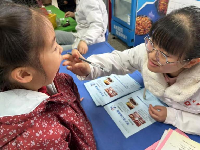 “小朋友,张大嘴巴,让我们看看有没有‘小虫子’在牙齿里安家?”在口腔检查环节,医护人员耐心引导小朋友配合检查,一边细致排查牙齿发育及龋齿情况,一边用亲切话语轻声安抚,有效缓解孩子们的紧张情绪。