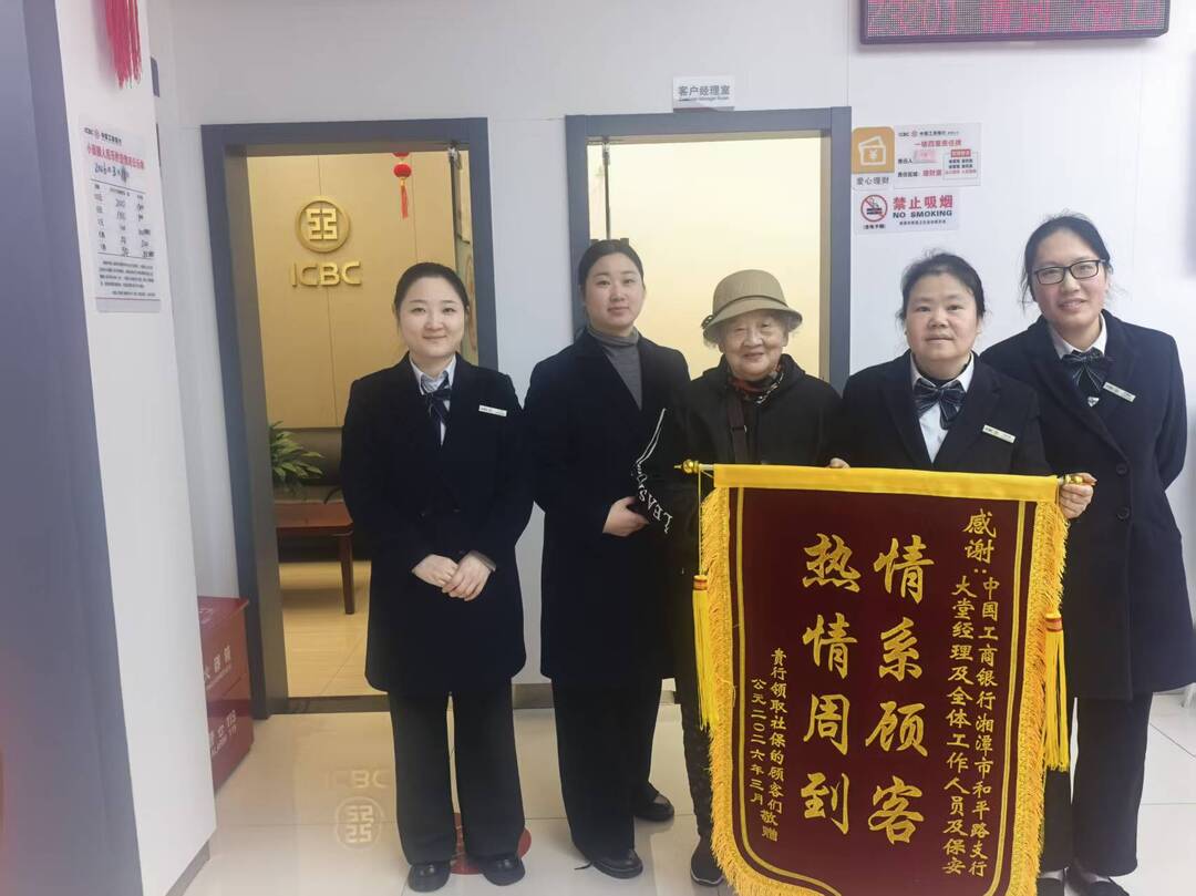 华声在线3月27日讯(通讯员 李慧婷)2026年3月26日,一面印有“情系客户 热情周到”的锦旗送达中国工商银行湘潭和平路支行。这不仅是一份荣誉,更是客户对该行长期以来提供贴心的金融服务,特别是对老年群体悉心关爱的高度认可与诚挚感谢。
