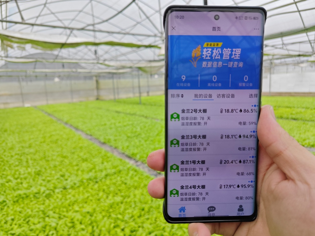 打开手机端APP“惠农云助手”,屏幕上清晰地显示着大棚内的温度、湿度等实时数据,此外还有数值预警、历史问题记录等功能,全县烟苗的长势情况一目了然,即使远在“千里之外”,手机也能作为终端设备,实施远程监控,“手机成了我的新农具,管理更省心了!”刘运林说。
