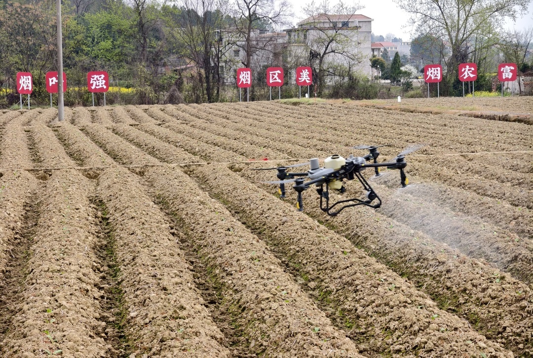 衡阳县洪市镇大印村高标准烟田内,望着自家刚移栽完的烟田,种植大户胡科能脸上满是笑容:“今年春天气候好,防治管理也细致,我心里踏实了!”边说着,胡科能边操作植保无人机,只看无人机在天空中起舞拂过,伴随着“嗡嗡”声,载满农药的无人机沿着预设路线在烟田上喷洒。“从栽完烟苗,到打药施肥都离不开这个‘铁家伙’,一小时就能打200亩!”他说。