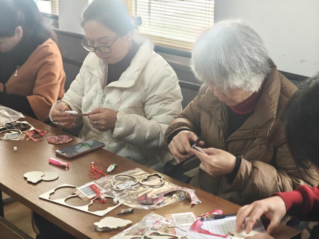 随后进入手工制作环节。本次活动以宋锦风铃为载体,将传统工艺与清明文化有机融合。宋锦作为我国传统丝织工艺珍品,纹样典雅、意蕴深厚,承载着对先人的追思与对美好生活的祈愿。在社工耐心指导下,居民们认真裁剪宋锦面料,搭配流苏、铃铛等配件,亲手制作出独具心意的风铃作品,在动手体验中感受传统文化魅力。