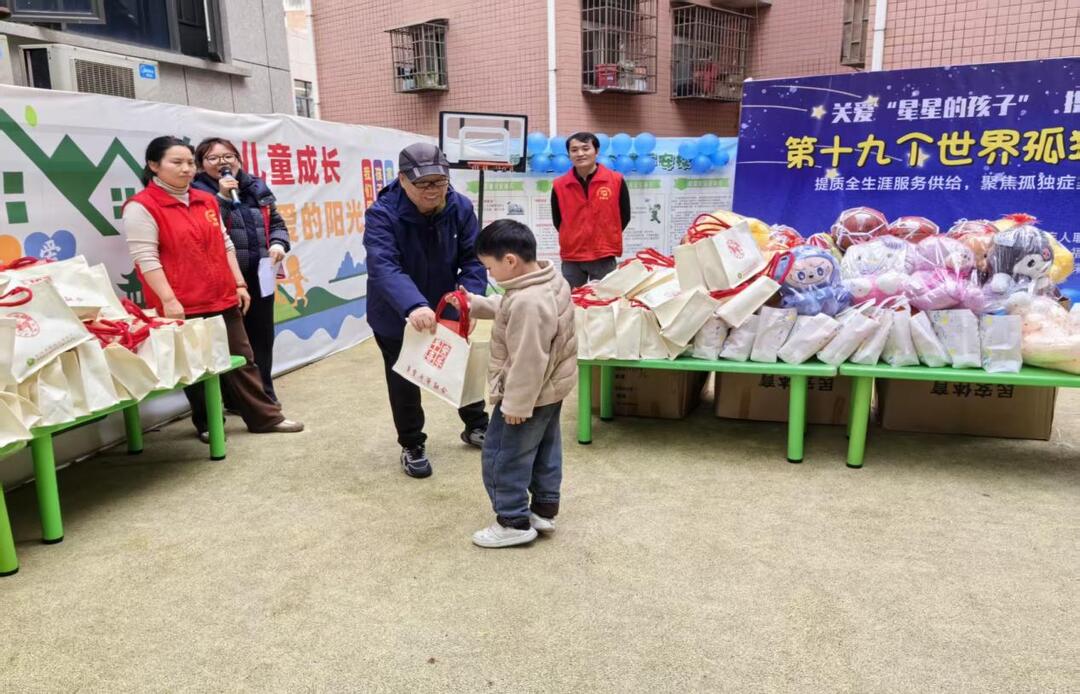 活动最后,孩子们收到了由邵阳市大祥区残疾人联合会、邵阳市残疾人福利基金会精心准备的益智玩具和健康零食等礼物,并合影留念。主持人表示:“愿每一位‘星星的孩子’都能被世界温柔以待。”