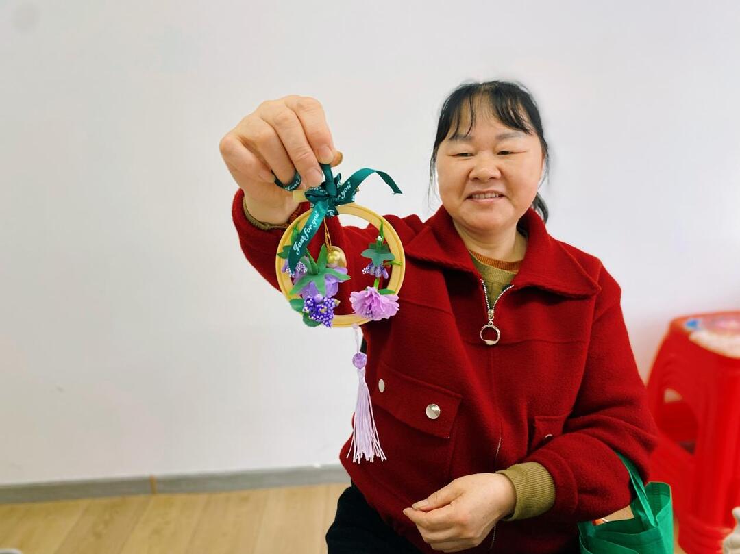 活动现场,社工向大家细致讲解清明节的由来、传统习俗及文明祭扫的重要意义,引导大家以手工创作的形式寄托对先人的缅怀与追思。随后,分发藤圈、绿叶干花、丝带、铃铛、彩绳等丰富材料,社工耐心演示制作步骤,从花叶搭配、固定造型到铃铛悬挂,每一个环节都讲解得通俗易懂。大家或凝神创作,或交流心得,现场欢声笑语不断。经过细心修剪、粘贴,整理材料、固定挂件。不多时,一个个造型别致、寓意美好的风铃花环陆续成型,随风摇曳,清脆的铃声仿佛将思念传递到远方。