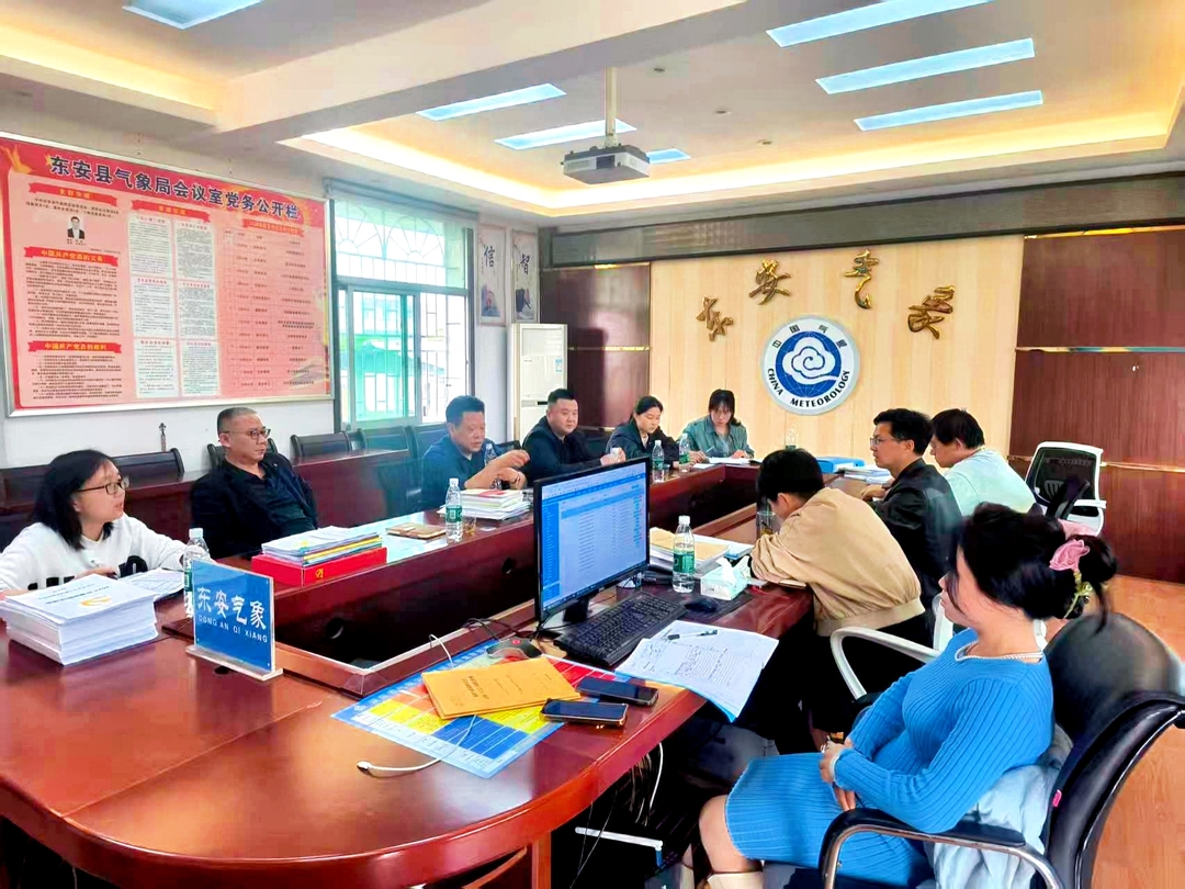 ▲图为市气象局党组书记局长、局长黄海涛一行在东安县气象局开展汛期综合大检查