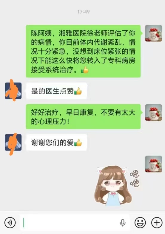 王婷医生作为中心的家庭医生,曾在湘雅医院全科进修,其凭借扎实的专业知识与丰富的临床经验,敏锐地察觉到患者血糖异常背后可能隐藏着严重的健康风险。为进一步明确病情、保障患者安全,依托中心与湘雅医院共建的"基层首诊-快速转诊-专家接诊"联动机制,启动家医团队"1+N"服务模式,立即通过湘雅医院双向转诊绿色通道,第一时间将陈女士转诊至湘雅医院全科医学科徐霞教授处。徐霞教授完善检查,确诊陈女士为2型糖尿病并酮症酸中毒,胰岛功能严重受损。徐霞教授迅速组建专科团队,并对患者展开救治;经过专业的住院治疗,患者现血糖控制稳定,且已出院。