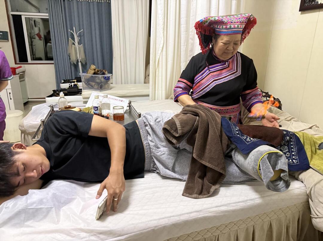 作为2025年湘超联赛冠军永州队的专属医疗保障团队,江华瑶医团队此次再度出征,充分发挥瑶医药“外治为主、内治为辅”的特色优势,为江华队打造赛前、赛中、赛后全周期健康守护体系。赛前,瑶医医师便为运动员开展牛角拔罐、瑶浴泡脚、火疗等非遗特色理疗。针对足球运动高强度对抗易引发肌肉疲劳、关节酸痛、寒湿瘀堵等问题,帮助球员快速缓解训练积累的身体劳损,以最佳体能状态迎战赛场。